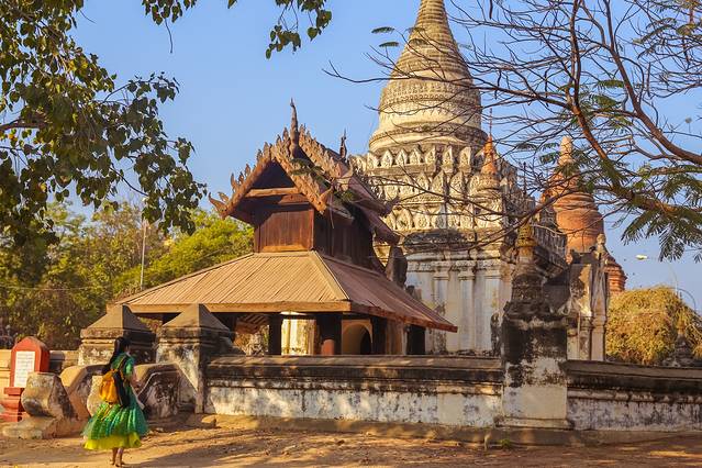 9.卜帕耶佛塔(Bupaya Pagoda)位于伊洛瓦底江(Ayeyarwaddy River)的东面,少见的阿奴律陀王朝之前的建筑。建于7-8世纪。原是蒲甘最古老的佛塔,我们现在看到的佛塔是在1975年地震后重建的。Bupaya的意思是“一个葫芦形宝塔”,传说记载蒲甘平原第一位国王Thamuddarit治国时,遇老虎、飞天鼠、公猪、大鸟和大葫芦五种怪物作怪吃人,直到Pyusawhti王子带着神钵收服这五种怪物,并在征服怪物处盖此佛塔。