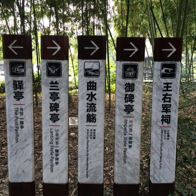 "曲水流觞"是兰亭非常著名的景点。流觞亭前,一条"之"字形的曲水,中间有一块木化石,上面刻着"曲水流觞"4个字。显现了王羲之《兰亭集序》所描绘的景象"此地有崇山峻岭,茂林修竹,又有清流急湍,映带左右,引以为流觞曲水"。