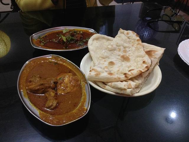 尼泊尔当地的手抓饭,有酱料,汤和酸奶。