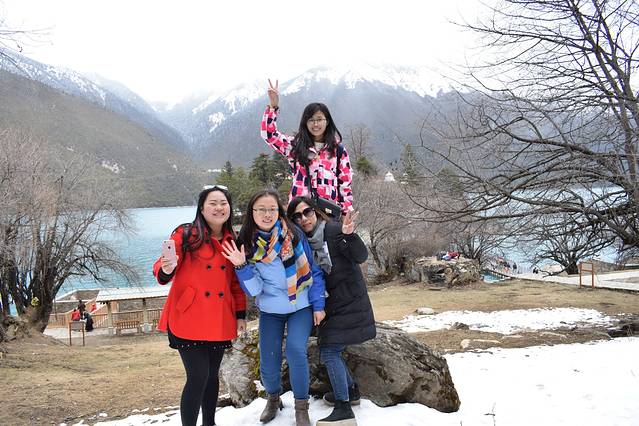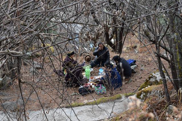 巴松措景区一角,聚餐的藏族人,天还飘着雪,可有情调了