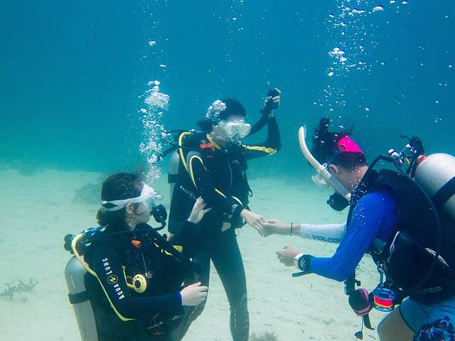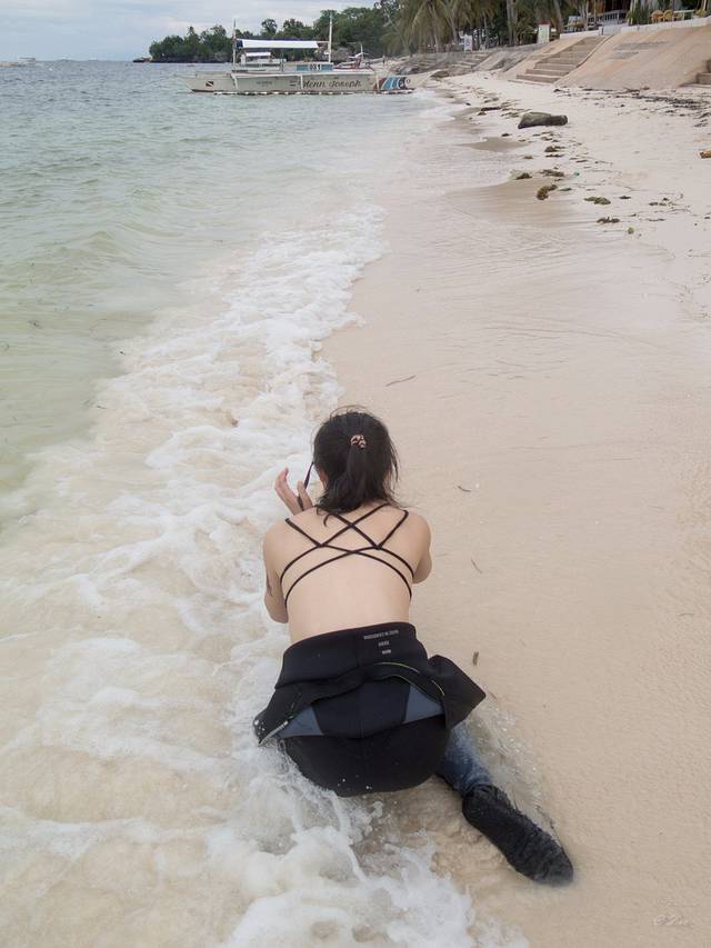 为嘛我们这样跪在海底,真的,真的不是在进行什么神秘组织觐见XX教主的活动。是粉粉教练在授课,灰常之耐心且仔细,每个动作的示范与点评都很用心。于是,我们跪在白白的海滩上,听教练讲起,那潜水的事情。哎嘛,教练,我这马屁拍的你要给我满分的哈~~