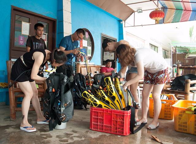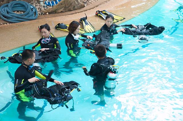 泳池训练前,和buddy们一起练习拆装BCD,我对BCD爱的深沉,感谢它让我能在水下自由呼吸,好吧,好像有点肉麻~~。再看看旁边教练一脸严肃,“我就看你们装~接着装~~”