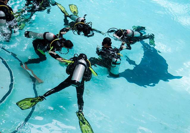 下水了,下水了,哪怕是个泳池,我也是很激动的。教练正在言传身教潜水技巧。严肃脸:非常客观的说,OW的学习就是为了能够在海里安全又尽情的享受潜水乐趣,每一个细节都可能关乎着自己的小命。因此,灰常感谢土匪教练认真又严谨的教学,你看,我听的多认真,哈哈~~
