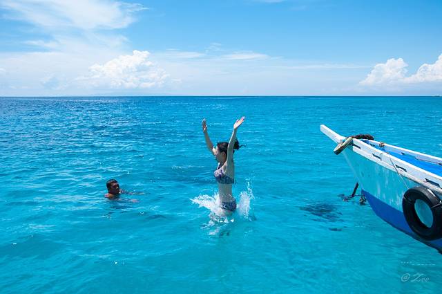 如此美景,不能不装,只是,在海浪摇啊摇的海面,还没抬脚就有种秒秒钟被甩海里去的赶脚。拍到崩溃,终于站稳出了片,谢谢耐心的buddy~~