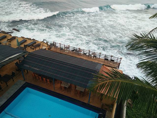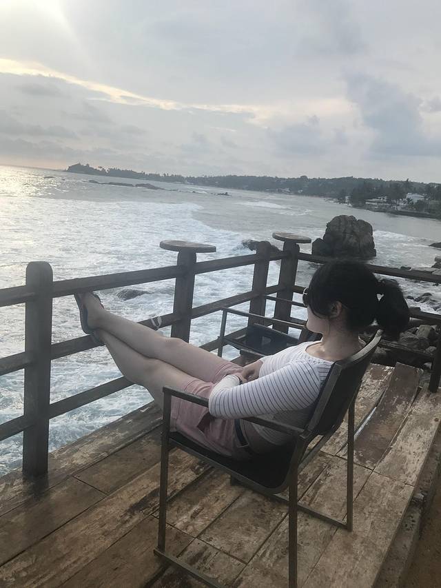 不过当时实在太热了,我们只在古城走了一圈就急忙回酒店避暑了,酒店是Hotel Rock Fort,也有五星级的规格。后两天我们大多在酒店叫room service,酒店的西餐和甜点都很不错,但其实加勒也有一些很好的餐厅。这间酒店其实是在乌鲁瓦图那,也是一个海边的城市,从酒店的房间就可以俯瞰海景,泳池边就是大海,第4、5天住的酒店都非常值得推荐。兰卡有名的高跷渔夫是在下午出来的,司机问我们看不看,我们可能没听到或是没听懂,所以没看上,这个很有特色所以觉得有点遗憾。于是傍晚太阳下山后,我们就决定去泳池边拗造型了,我同学游了会儿泳。