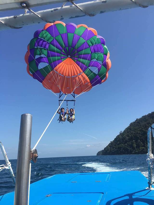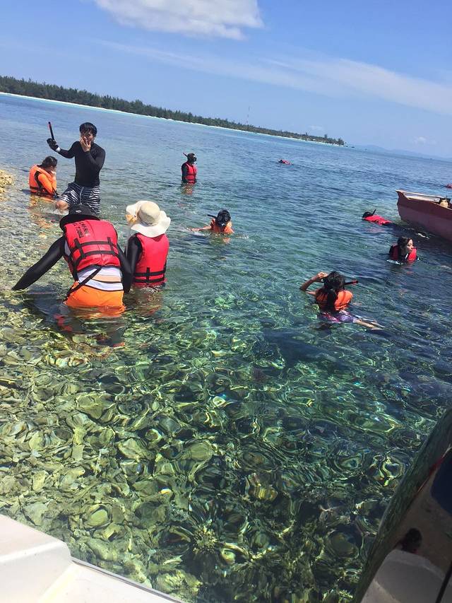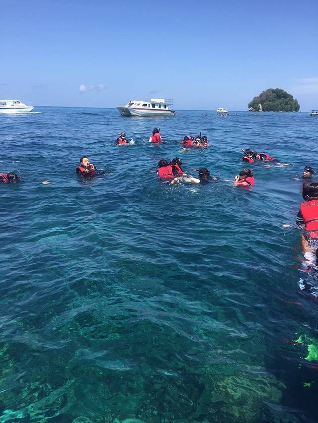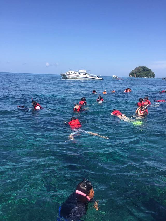 沙比岛一日游:今天是自己去码头买门票。在亚庇碰到熟人。约了今天去沙比岛游玩。一行人中有人会英语。所以到码头就碰到之前她一日游的导游。沟通后包船过去含进岛费13人320马币。浮潜的装备每人10马币。拖伞130马币两人。中午自助餐60马币一人。小孩40马币一人。这个岛海水清澈。鱼群很多。能看到蜥蜴。
