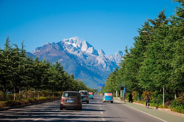 掏出手机用滴滴约了一辆车出发束河古镇,束河其实是近两年才开发的一个古镇。车子行驶在路上的时候,便可远远的看到玉龙雪山。虽然已经是3月开年的春天了,但是玉龙雪山的顶端依然被积雪所覆盖着,远远的看着是那么的神秘。