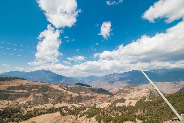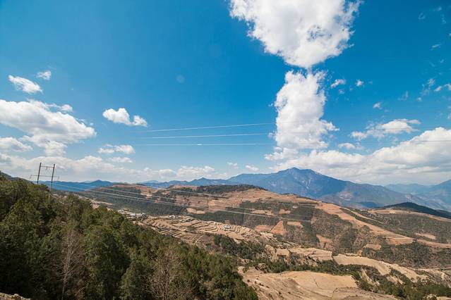 远处的玉龙哈巴雪山在蓝天白云间显得那么祥和,站在半山腰的高处,阵阵的微风吹过来,让人感受到此时才是真正的深入到彩云之南中来。