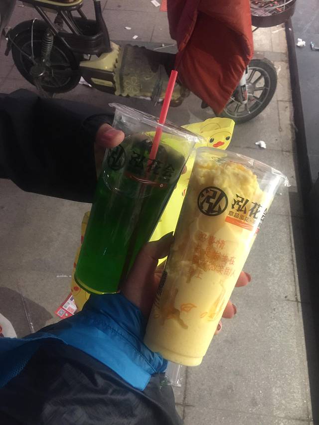 绿色的是他的猕猴桃汁(6元/杯),黄色的是我的榴芒奶昔(12元/杯)。