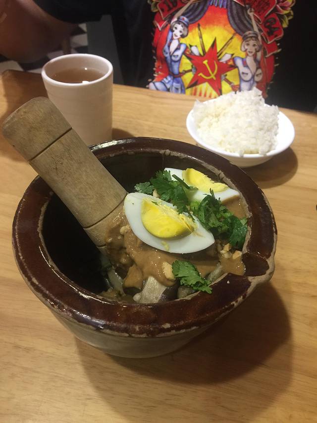 每桌必点,欠揍的茄子,14元/份,用麻将拌的,连着鸡蛋一起捣碎了吃,实话说太糊嘴了,茄子应该跟蒜是绝配啊,竟然不放,哎,失败。