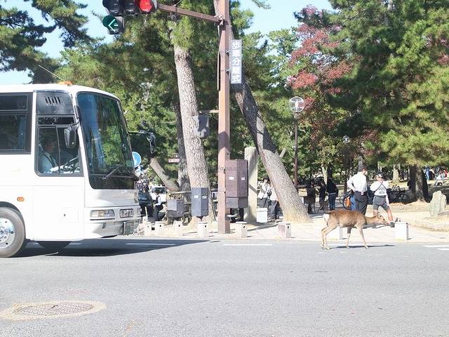 这辆大巴士在等这个鹿走过去,场面很温馨