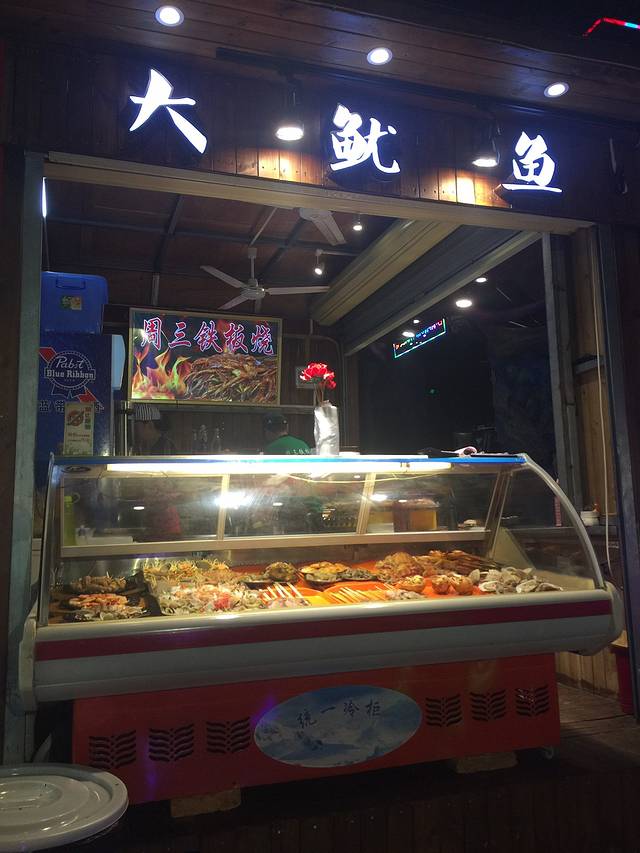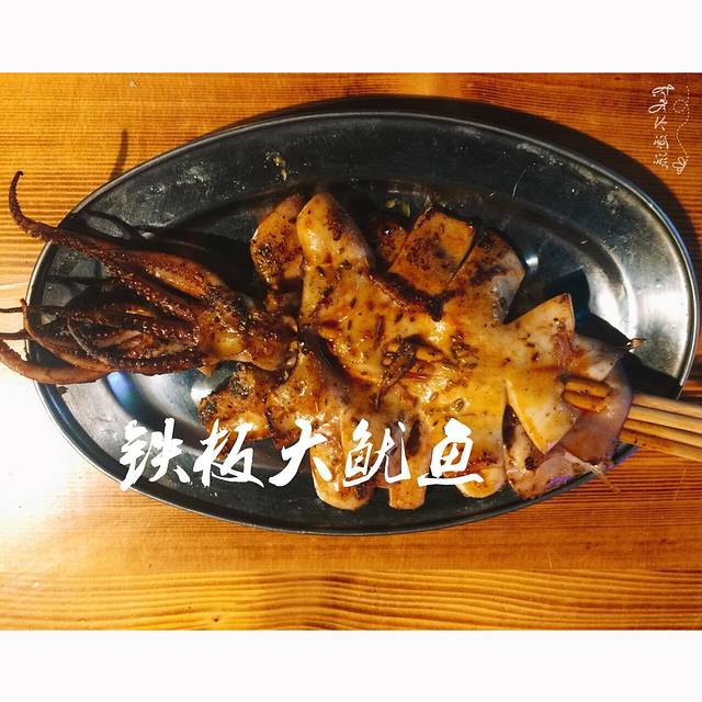 我和老公晚上在大东海航拍,之后经过海边的海鲜烧烤大排档一条街的时候发现的这家小吃,牌子上写着大鱿鱼三个字,主要做铁板烧烤。
