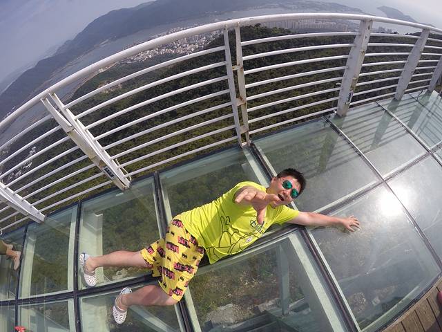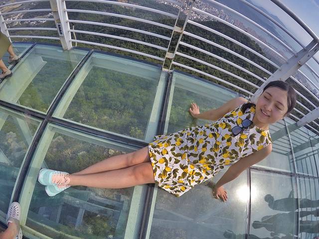 脚下是玻璃做的地板,平时坐过山车的勇敢都消失不见,居然战战兢兢不敢看脚下
