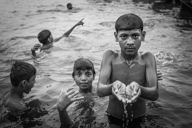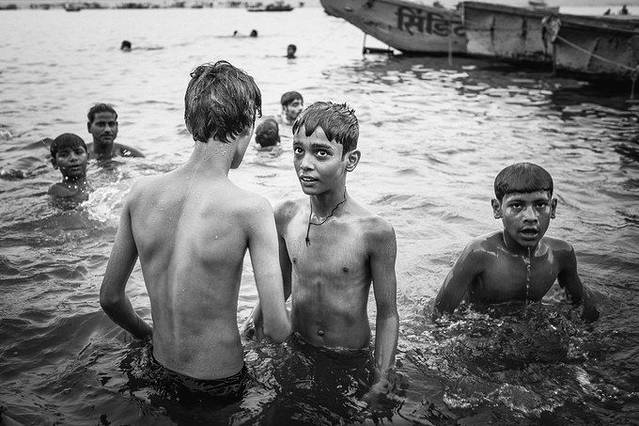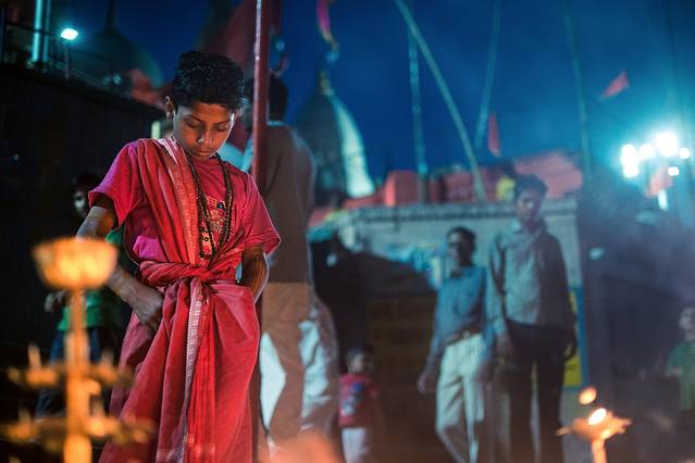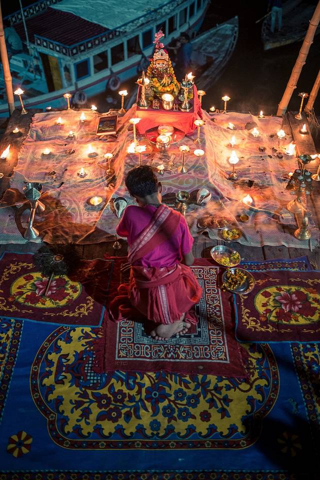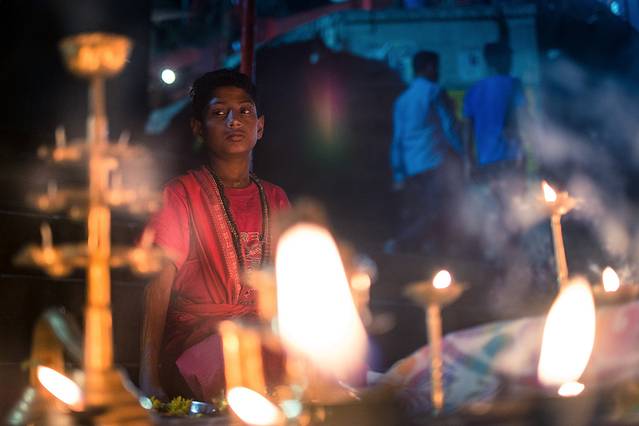 我没有为夜祭逗留,继续在恒河边四处游走,拍下了这个在父亲指引下学习祭祀的小男孩。