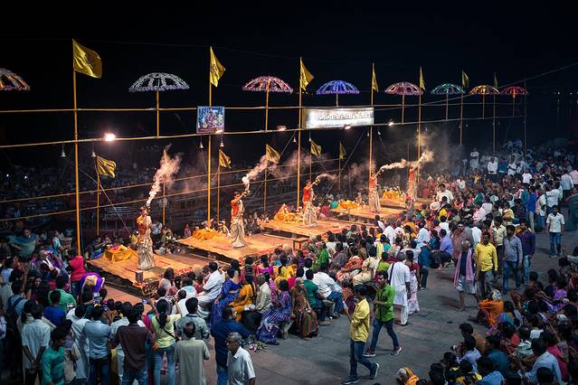 傍晚时分人群汇聚在Dasaswamedh Ghat,等待着恒河夜祭的到来。