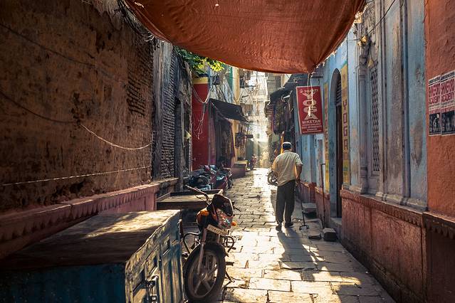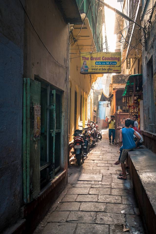 ▲穿行于迷宫一般的街巷间,炙热而湿润的空气中弥漫着焚香、汗水、垃圾、粪便和香料混合的味道。石板铺砌的路面被磨的光亮,我在遍地垃圾、人与畜的粪便之间小心行走,不时还要为神牛让路。目光所及的房屋建筑或都超过百年,猴子在破败的墙壁间攀爬跳跃,不时会落下尘土。污水顺着墙壁留下,最终在墙角蒸发,弥散于空气中。逼仄的巷道上方是凌乱交错的电线,阳光只能从楼宇狭窄的缝隙间倾泻下来,每个角落都阴暗潮湿。