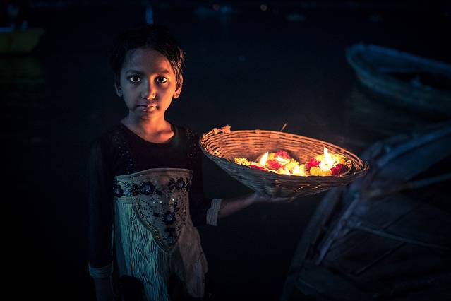 ▲小女孩拉着在河边游走的我买河灯,别人都是买一盏河灯放入恒河,而我买了一盆让她全部点亮并为她拍了张照片!