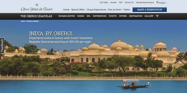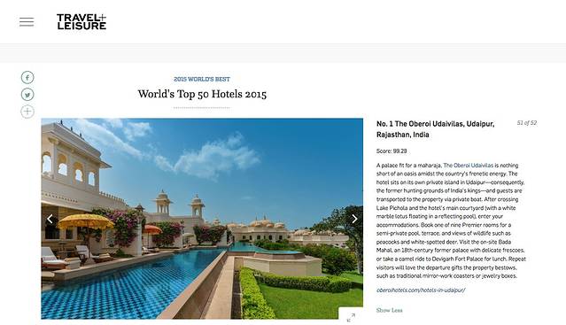 ▲2015年7月,The Oberoi Udaivilas被Travel + Leisure评选为2015年全球顶级酒店第一名!