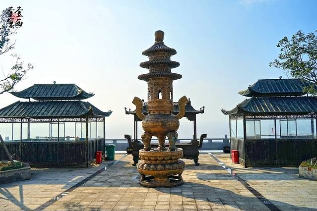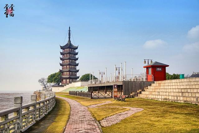 上图,是海宁观潮公园内的占鳌塔,又名镇海塔,是一座为镇服潮神而建造的楼阁式佛塔。始建于宋代,重建于明代,至今已有380多年历史。占鳌塔高40米,周围25米,平面呈六边形,外观七层,内为八层,砖身木楼,造型极为壮丽。登临占鳌塔观一线潮,是海宁潮观赏的最大特色,登塔俯视,盐官古城风貌尽收眼底,杭州之玉皇、硖石之东山也隐隐可见。