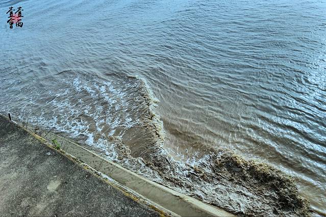 说着说着,潮水前线来了。这是今天的一次潮。观潮公园有每日潮水前锋到达时间的预报,但自然并不一定能被牢牢把控在人们手中,比如我们的钱江潮小哥行进途中发生意外,路遇美女想要停下搭个讪。于他而言是个不错的体验,但于我而言,就不太美妙了。所以,Sissi建议观潮需要提早10分钟到达潮点候潮较为妥当。
