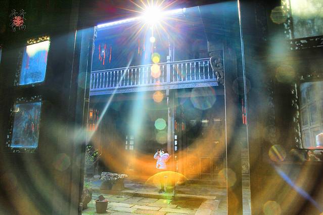 整个酒店是个仿古建筑群。我不知道内行们怎么看,外行Sissi认为还是与古城挺般配的。走在酒店的青石板小街上,颇有点风檐展书读,古道照颜色的意境。我们入住的房间位于一栋仿古二层四合院内。底楼有个可以望见星空的小院和客厅。当三五好友聚住在同一屋檐下,那融洽的感觉还是相当不错的。房间内装倒不完全是中式。地板是青砖的,窗棂也是古色繁复的。但床的靠背,桌子之类的设施,又依照着舒适简洁的原则来设计。虽是中西结合,但看得出酒店在搭配上下了功夫,倒也不会觉得不伦不类。房间内的摆设,譬如书本与茶具,又从细节上提升了酒店的格调。第二日晨起拍摄时,信步逛入古城,竟几乎没遇到人。阳光洒下,倒是呈现出了我最欢喜的宁静平和。