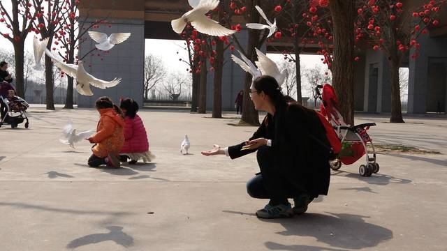 天气不错,法门寺正门口有很多白鸽,有小贩卖给鸽子的粮食,很多小朋友跟着家人一起来玩