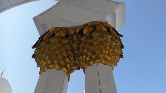 谢赫阿布扎比清真寺共有24套贝壳拼花圆柱,此工艺是将贝壳镶嵌入石材,采用垂直流线型拼接工艺,改变了传统的水刀拼花圆柱直线拼接的方式,该工艺为世界首创,已申请国家发明专利。