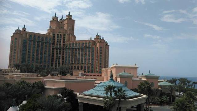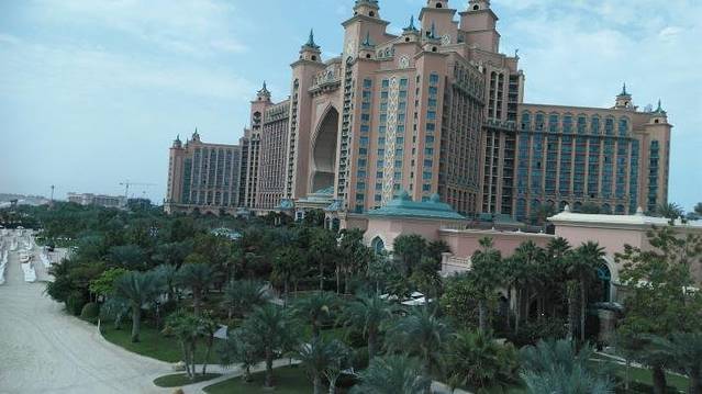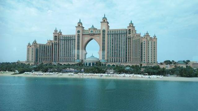 亚特兰蒂斯(Atlantis),耗资15亿美元兴建,坐落阿联酋迪拜的棕榈人工岛上,占地113亩,有1539个房间,如同古波斯和古巴比伦建筑装潢风貌。2008年9月24日隆重揭幕,当中最贵的套房盛惠3.5万美元一晚,内有三间睡房和三间浴室,并有一张可供18人用餐的金叶餐桌,气派非凡。酒店的最大特色是大堂设有一个巨型水族缸,内里有6.5万条鱼。此外,还有一个海豚池,饲养了20多条从所罗门群岛进口的瓶鼻海豚。此外,酒店拥有四家由星级名厨掌舵的高级 餐厅、一家夜总会、一间水疗及健身中心,还有偌大的会议中心等设施。