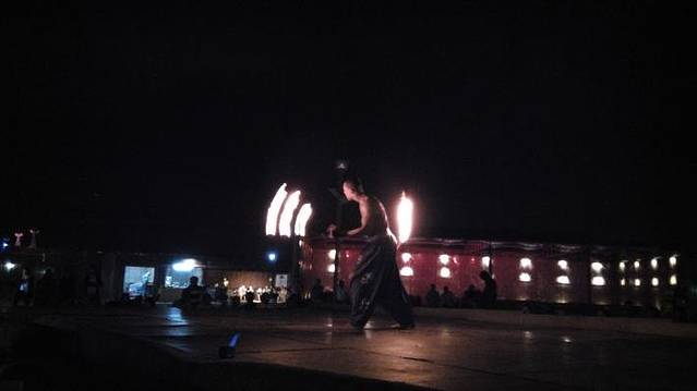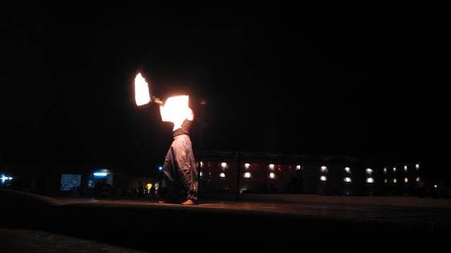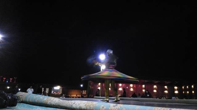 紧接着沙迦伊斯兰文明博物馆 ,太阳完全落坡了,而沙漠营地里的狂欢节目也拉开了序幕。沙漠营地由很多大帐篷围成一个院子,院内四周铺着厚厚的羊毛地毯,游客们围坐在上面品尝着香气扑鼻的美味烧烤和各式阿拉伯食品。院子中间用地毯铺出一个很大的“舞台”,一位阿拉伯女郎在上面跳着热情奔放的肚皮舞,为游客助兴。跳完几曲之后,舞者就开始热情地邀请游客一起跳起来。