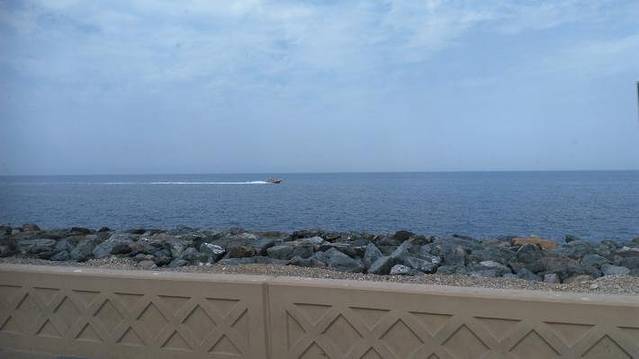 波斯湾海滩是免费的,碧蓝的海水中有不少人在游泳