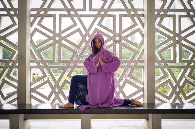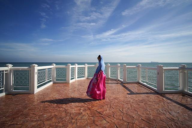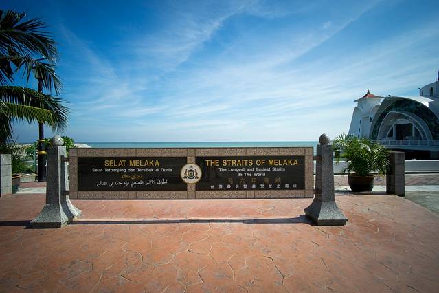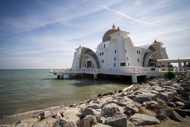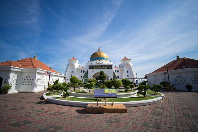 马六甲海峡清真寺,位于人工修筑的马六甲岛上。如果水位高,它看起来像一座浮动的建筑。落日余晖下的海峡清真寺很美丽,广播里传出的诵经声与海浪声相互交织,夕阳西下映衬着金色的穹顶,坐在海边的堤坝上欣赏这一美景是件很惬意的事。