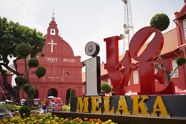 从西山(即升旗山)下来,便能看见一个“我爱马六甲”的设计物,据说在马来西亚各个州都有一个,分别写着不同州的名字,例如在吉隆坡就是“我爱吉隆坡”,许多游人都会选择在这个标志物边上拍照留念,以纪录走过大马的每一座城。