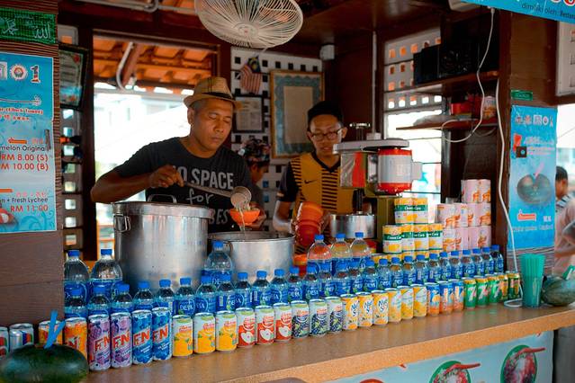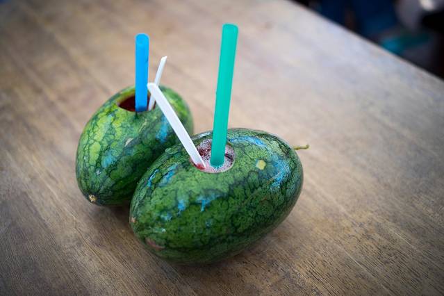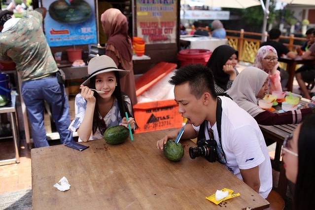 马六甲的吃法很特别,在西瓜上开个小孔,将搅拌机伸进去搅碎西瓜肉,再投入几粒冰块,插着吸管就喝起来了。