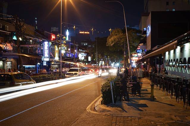 顺着落日的方向,一路走走停停、看看拍拍,不知不觉便行至传说中阿罗街,说是街,实际有几分似菜市场。密密麻麻地设立了不少临时摊档,有卖水果的、卖零食的、卖小吃的、卖工艺品的,还有一些大排档,火得不行的黄亚华小吃店也在此。