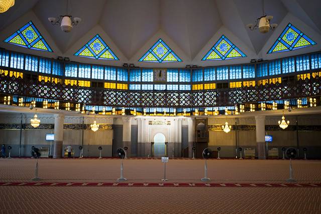 国家清真寺,于1957年开始构思,1965年完工。原来是要以第一位马来西亚总理东古阿卜杜勒·拉赫曼命名,但他拒绝了,而提议把清真寺命名为“国家”,庆祝马来西亚以不流血方式获得独立。其用来播放颂经的尖塔高73米,蓝色的星型的屋顶有别于传统清真寺的洋葱头设计,象征了一个独立国家的抱负,非常的醒目。共18个尖顶,代表着马来西亚13个州和伊斯兰教的5个信条。清真寺的整体设计灵感来源于麦加的大清真寺,尤其是内部的装潢式样,都与麦加的相仿。大堂最多能同时容纳15000人祈祷,是全东南亚最大的清真寺。
