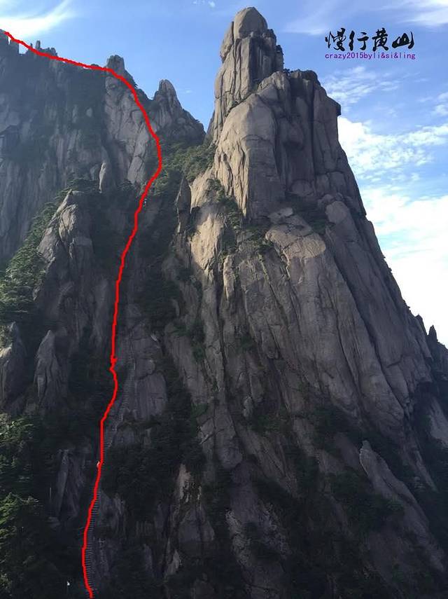 ↑ 从山脚往上望去,划红线的地方便是需要攀爬的,几乎是手脚并用,很多人在此会望而却步,但是真正的美景在上面呀,来到此地的朋友千万不要错过(话说昨天大雾貌似都会关闭天都峰)