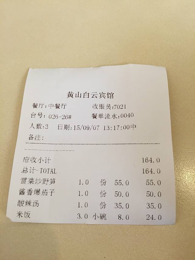 坐缆车(80元/人)到山上缆车站,5min不要,步行回白云宾馆入住,休息一会便去餐厅吃饭了(身上饱肚子一点不剩)。