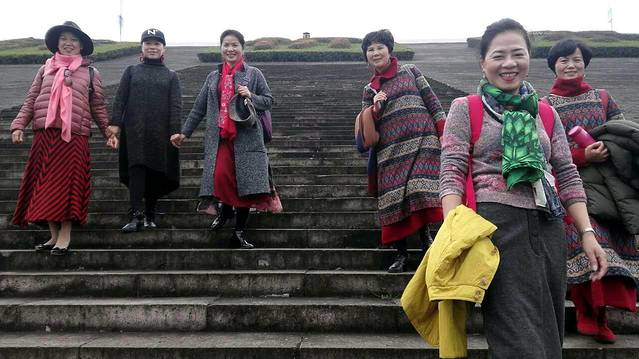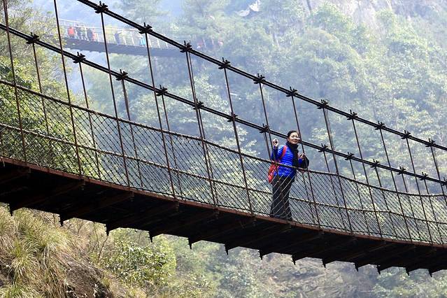 自然,喜欢上镜的女同学迅速在铁索桥中央占领了有利位置,等候摄影师的镜头。
