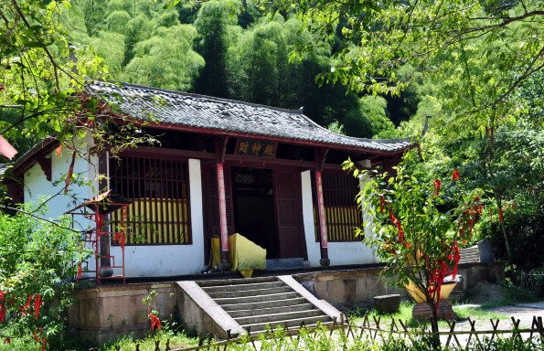 差不多走到谷底的位置,一座财神殿掩映在山坡绿树翠竹丛中,殿内香客不多,显得有点冷清。