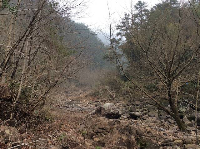 我们继续沿着财神殿前下坡小道到了谷底。一条不起眼的河滩横在眼前,因上游修筑水坝或因旱季,河谷已经见底,大大小小的石块裸露在河床上。