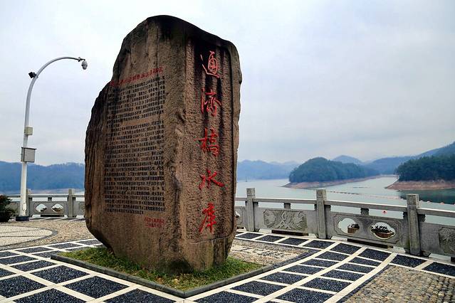 坝顶一头立了一块大石碑,一面刻着 “通济桥水库”五个大字,侧面则是一段介绍水库工程概况的文字。