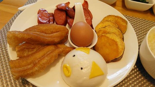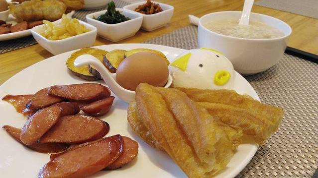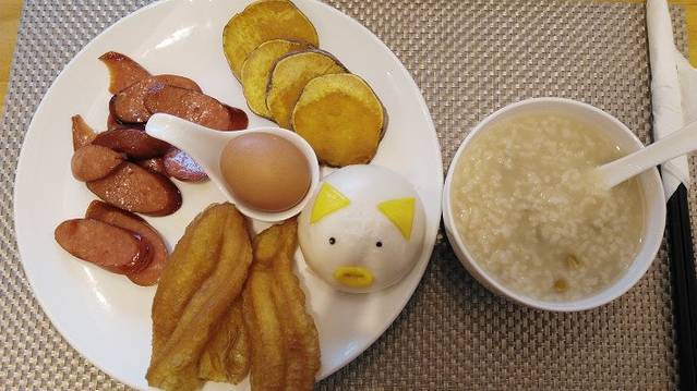 早餐有鸡蛋、红薯、奶黄包、油条、午餐肉,一碗绿豆小粥足以