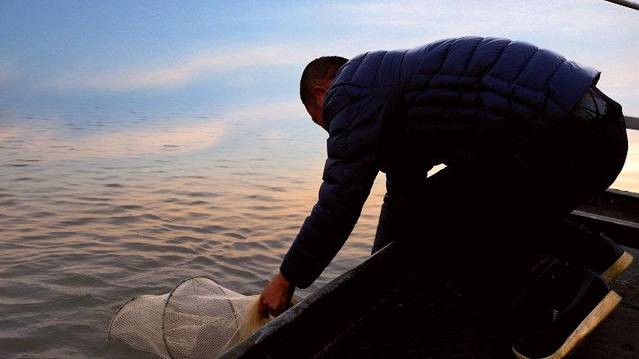 船到一太湖深水一处,我们今天的船老大开始收获放在水中的捕鱼网兜,