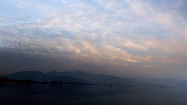 一叶小舟在茫茫太湖中行进,山环水绕,湖光山色静美。天空的也风轻云淡