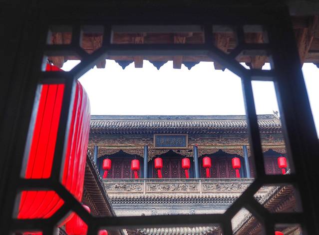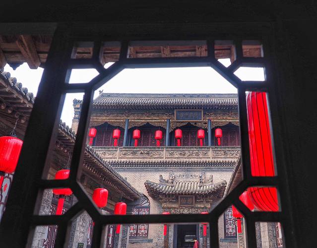 透过窗棂,好像是一个天然的取景框,拍下乔家大院的红灯笼。