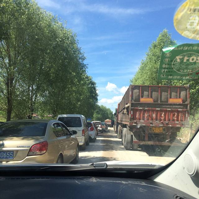 堵车了,右边一溜这种重卡大货。原因是修路。大货真的数之不尽,超之不竭。走这条路要注意安全,前后左右都是大货车,小车真的要特别注意,都不够人家轻轻碰一下的。