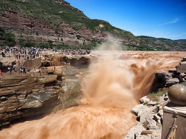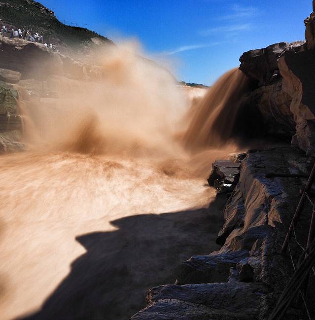 上游水面宽度为400米,到了壶口,猛然收紧为30-50米,于是水量充沛,犹如万马奔腾,气势如虹。