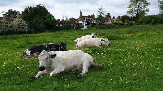我们沿着伊钦河边的小路向老城区方向走。路边开满野花的草地上有牛群自然安详。