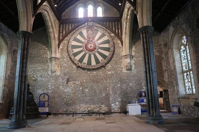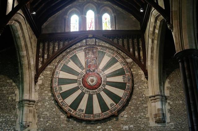 温切斯特的亚瑟王圆桌(King Arthur's Round Table)的历史可以追溯到1270年代。这是一个直径18英尺的桌子,黑白相间,上方是亚瑟王的画像,圆桌上列出了25个骑士的名字。传说每年,亚瑟将骑士们聚集到Pentecost的卡美洛城堡。不同的故事传说中有不同数量的骑士,从12到150、以至1600人不等。与有主次和对立关系的长条桌不同,圆桌代表与会者具有平等的权利。最早描述圆桌的作者是维斯(Wace),他的不列颠传说(Roman de Brutus of Britain Brut)是Geoffrey of Monmouth的不列颠王记(Historia Regum Britanniae)的细化,但即使是最早的作者们,包括Geoffrey和威尔士亚瑟传说(参见Mabinogion)将出众的战士归于亚瑟的领导。事实上,亚瑟王的传说的真实性至今无法考证,工作人员介绍说,这张桌子建造于亚瑟王死后700年,是一个中世纪华丽的仿制品。