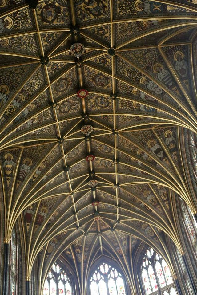 教堂是1475年嘉德勋爵开始建造,教堂中殿是英国垂直式建筑的典范,精美的扇形拱顶从廊柱间拱出。如果其他皇家教堂一样,这里也是皇家墓地,有10位英国王室埋葬于此。加起来仿佛是一部不列颠君王史